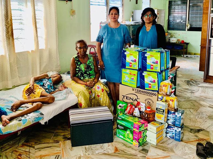 From right President Prema with Club Treasurer Sarala at Madam Kamala and Selvi's home with provisions donated by IWC Ipoh East.