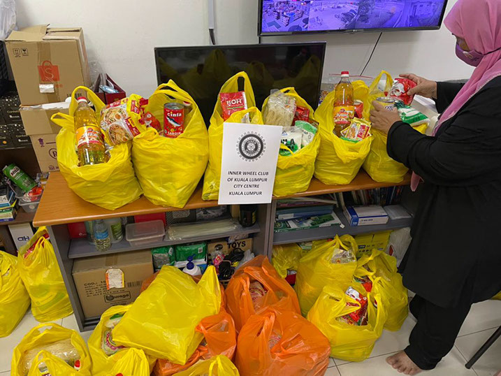 Club Treasurer Bibee Meghadin with bags of groceries containing various food items, ready to be distributed.