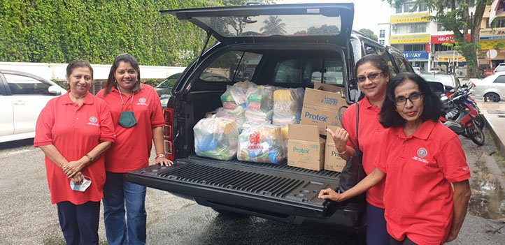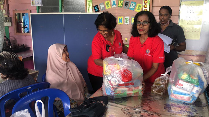 Charter President Datin Pathma and ISO Mdm Jeyarani distributing the essential items.