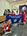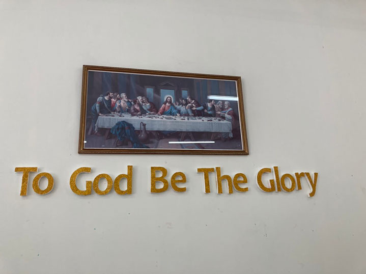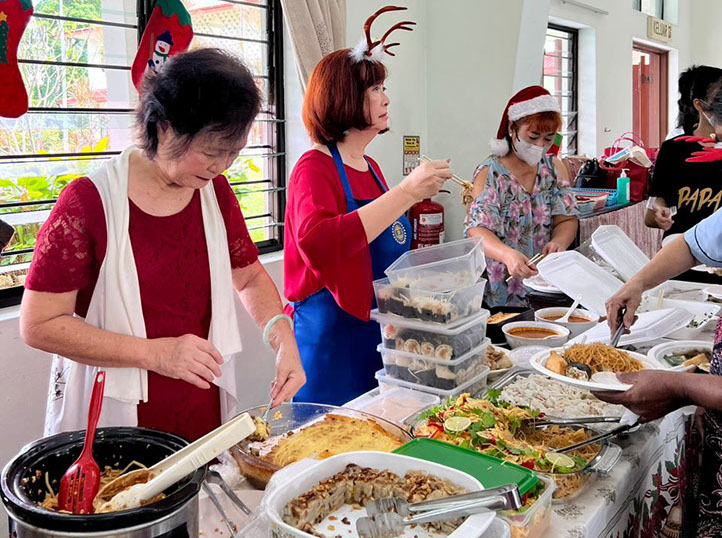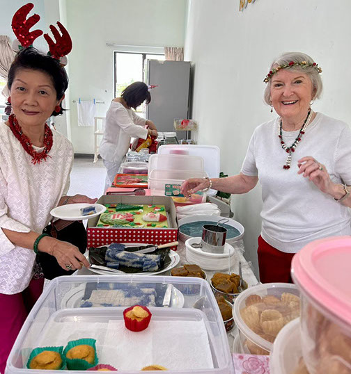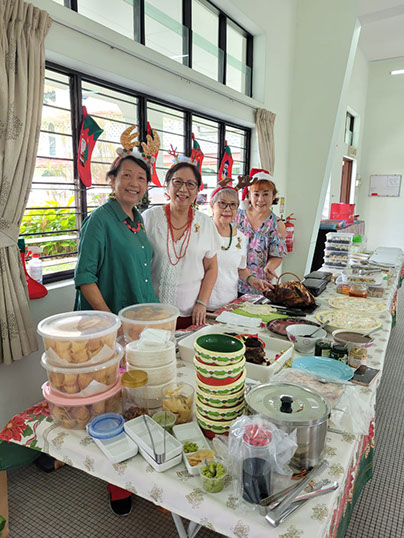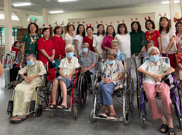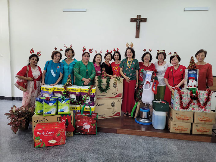 Honorary member presenting goodie bag to a nun, assisted by President and Advisor Juanita