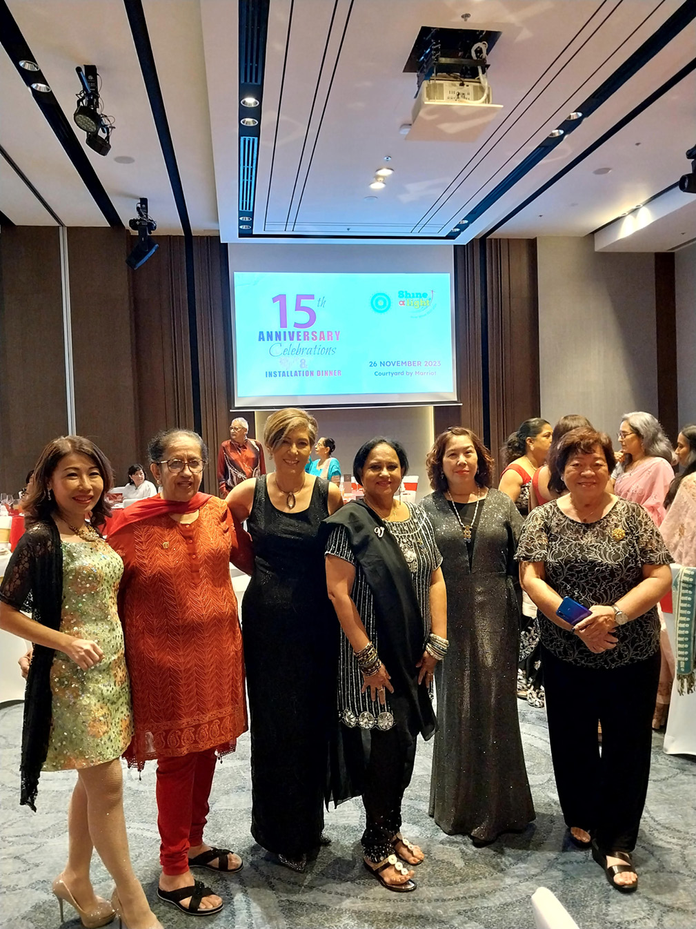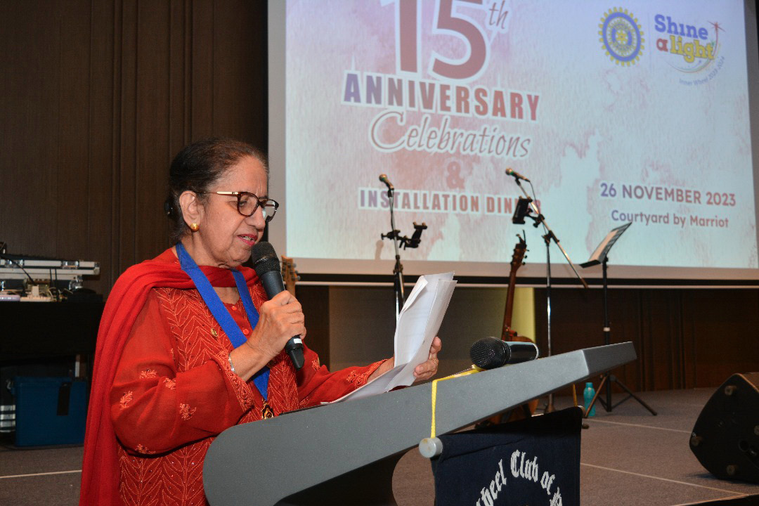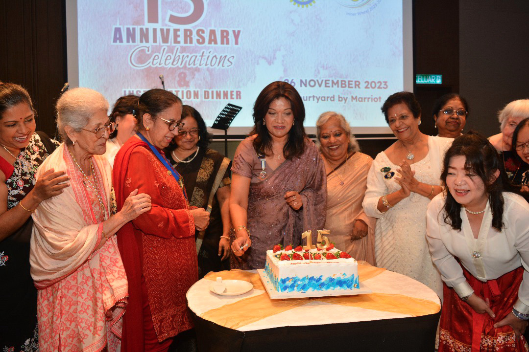 A dual celebration marked a memorable night for IWC Penang as the club observed the club’s 15th anniversary and witnessed the installation of Mdm. Daljit Kaur Gill as president for the second time. The event unfolded at Courtyard by Marriott on November 26, 2023, with a turnout of about 60 attendees. District Extension Chairman Shanti Menon graced the occasion as the guest of honour, alongside other distinguished guests, including PNR Parimala Satheesan, IIWPBD Datin Seetha Lakshmi, DE Lucy Barrock, and Dr. Amreet, the President of the Rotary Club of Penang.