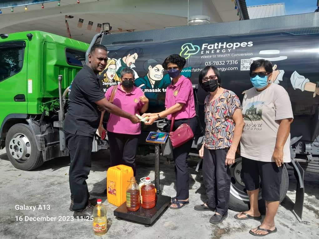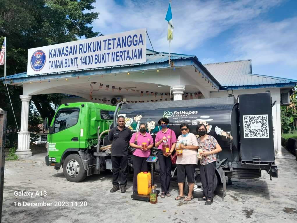 IWC Butterworth with President Shanthi Shanmugam at its helm, embarked on an environment-friendly project on Saturday, 16th December 2023. President Shanthi who is with the Committee of the Neighbourhood Association (Rukun Tetangga) of the Taman Bukit housing estate in Bukit Mertajam, successfully sought collaboration to start sourcing used cooking oil from her neighbours and other residents of the housing estate and selling to Fat Hopes Energy.