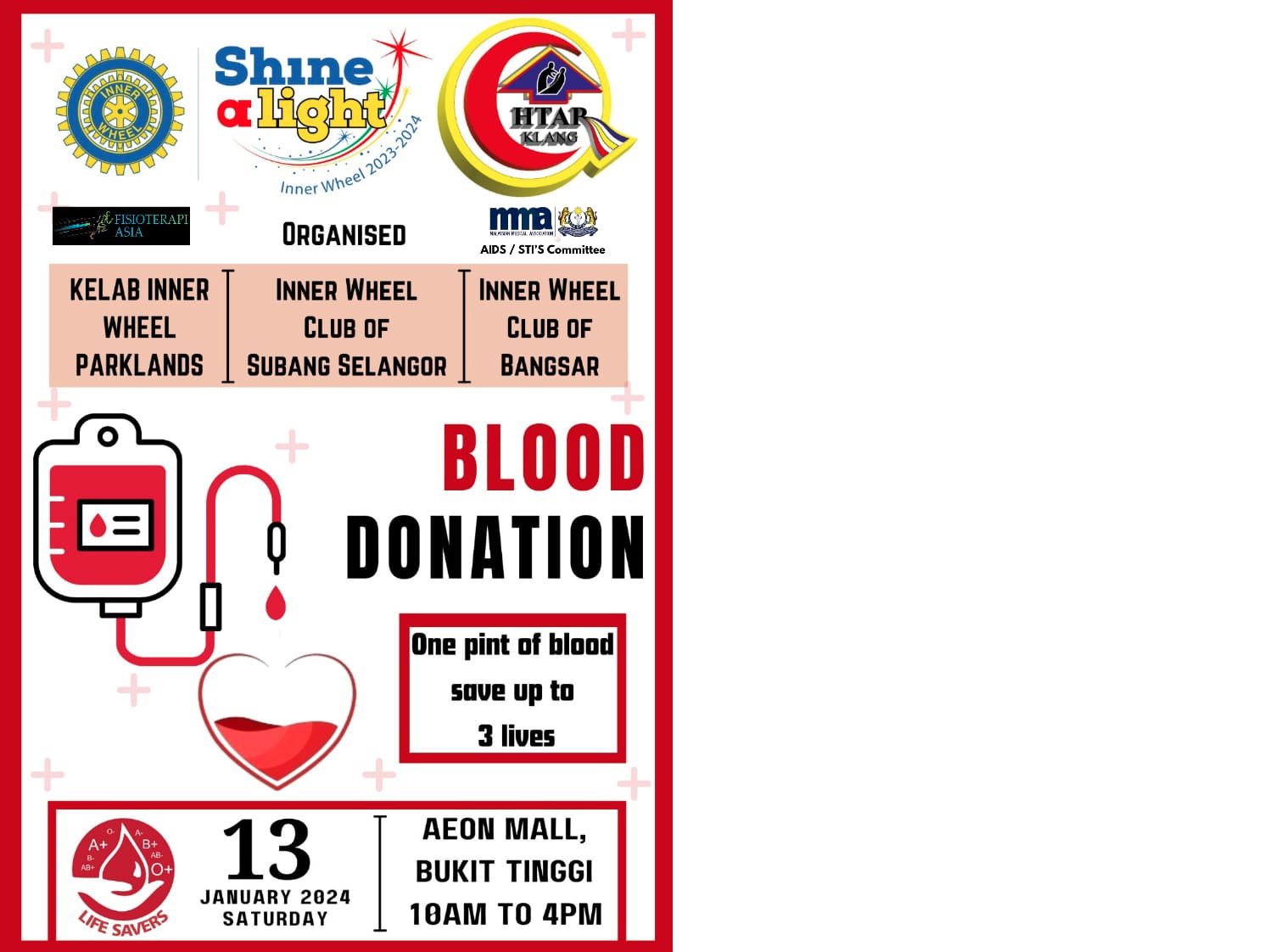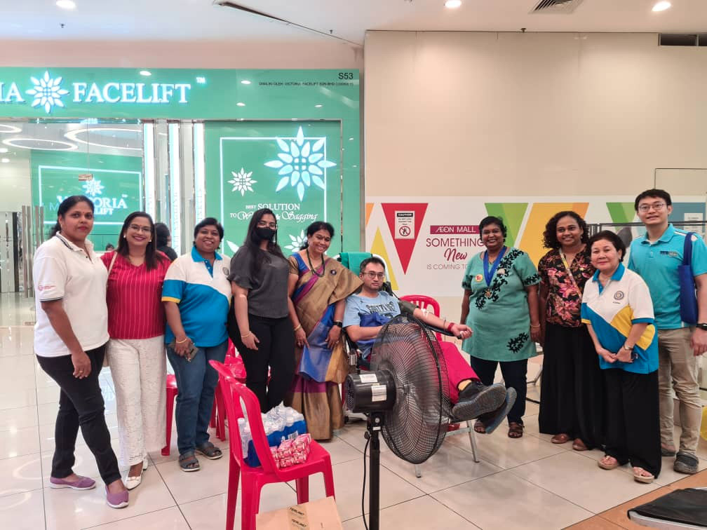 Blood Donation Drive during the International Inner Wheel Centennial celebration. This was a collaboration project organised together by IWC Bangsar, Kelab Inner Wheel Parklands and IWC Subang Selangor with a blood bank team from Hospital Tengku Ampuan Rahimah and Malaysia Medical Association (MMA) AIDS/STI’S Committee at AEON Mall, Bukit Tinggi Klang. 130 participated and out of 89 successfully donated blood. In addition, there was free physiotherapy consultation and AIDS awareness given to the participants. Charter President Mrs. Umarani from IWC Hyderabad Spandana, District 315 also participated in this project.