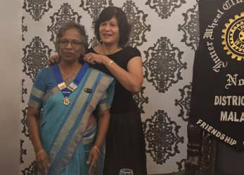 Past President Susan fastening the collarette on President’s Sarojini’s neck.