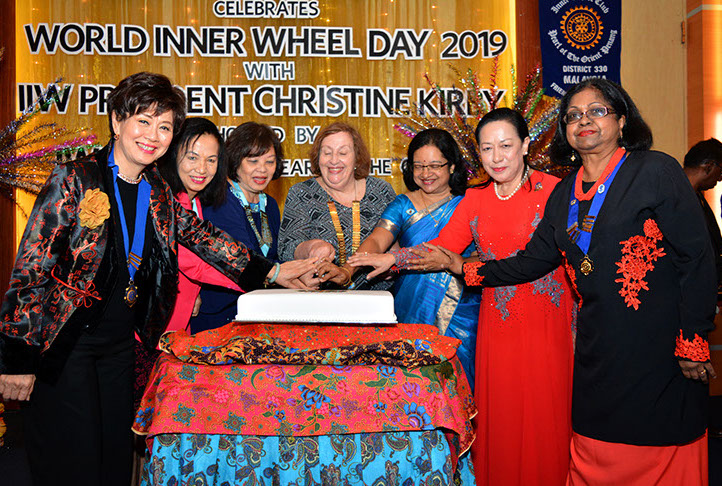 Cutting the birthday cake: President of the Pearl of the Orient Dr. Janet Lim, District 331 Chairman Datuk Nancy Ho, District 330 Chairman Peggy Lee, International Inner Wheel President Christine Kirby, National Representative 330 & 331 Datin Seehta Lakshmi, Datin Pearl Jai Mohan, President of the Inner Wheel Club of Penang Dr. Jeyalakshmi Ratnavale