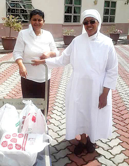 President of Inner Wheel Club of Penang, Datin Jacintha Aloysius, delivers food essentials like rice, milk powder and oil to Reverend Sister Antoinette of the Little Sisters of the Poor in Air Itam, Penang