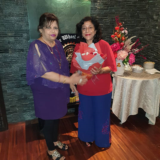Immediate Past President Molly presenting a bouquet to Outgoing President Jasbir Sarjit