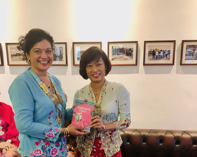 Dr Lee Su Kim presenting a copy of her book "Kebaya Tales" to DC Shanti Menon