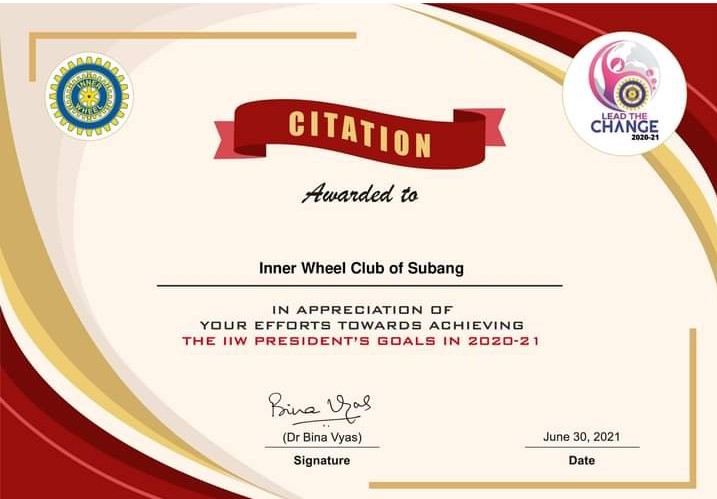 Citation Award to IWC Subang Selangor for efforts in achieving the IIW President’s Goals in 2020-21
