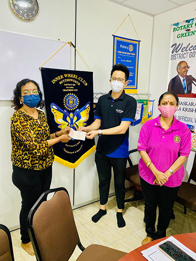 Club Treasurer Surya handing over the cheque to Mr Phang witnessed by President Santhi