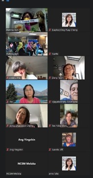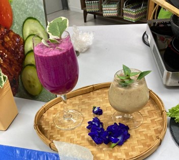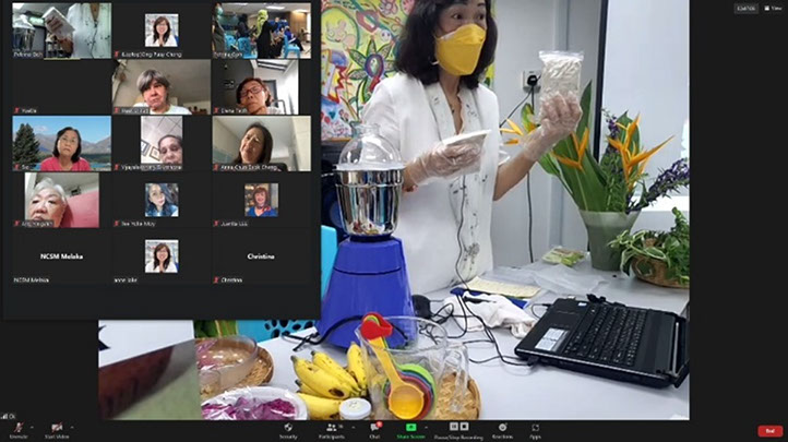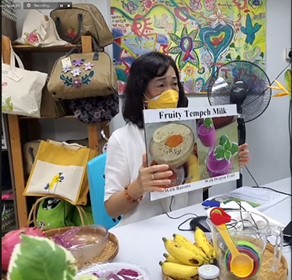 Petrina prepares to demonstrate tempeh milk fruit drink as zoom participants look on.