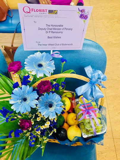 President Santhi handing over the Fruit and Flower basket to the Honourable Deputy Chief Minister II of Penang Dr P Ramasamy