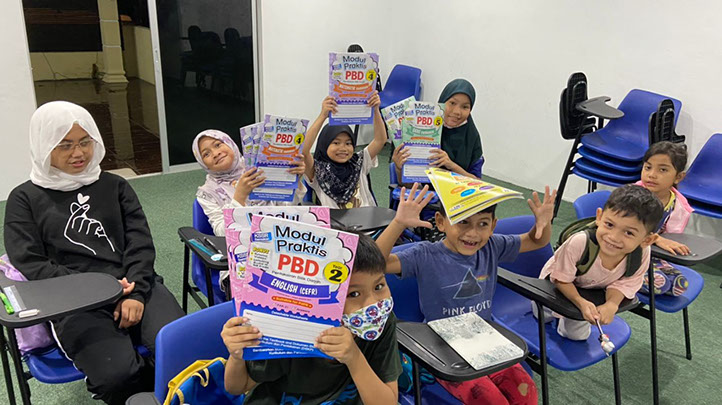 The happy students with the activity books.