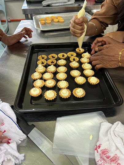 President Datin Santhi filling the tart moulds with pastry.