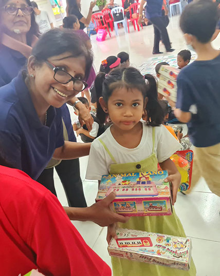 President Vasugi during distribution of goodies with one of the recipients