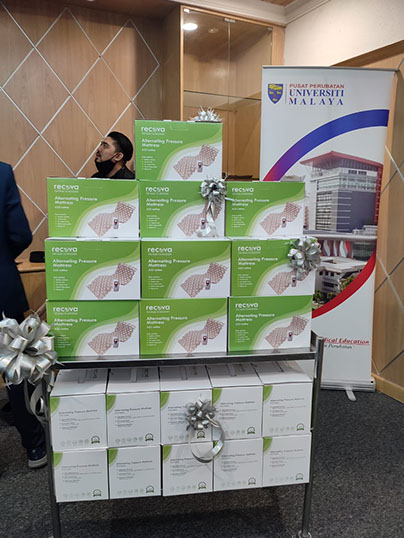 President Jinny handing over a box of Ripple mattresses to Deputy Director Dr Salleh, watched by Honorary member and others