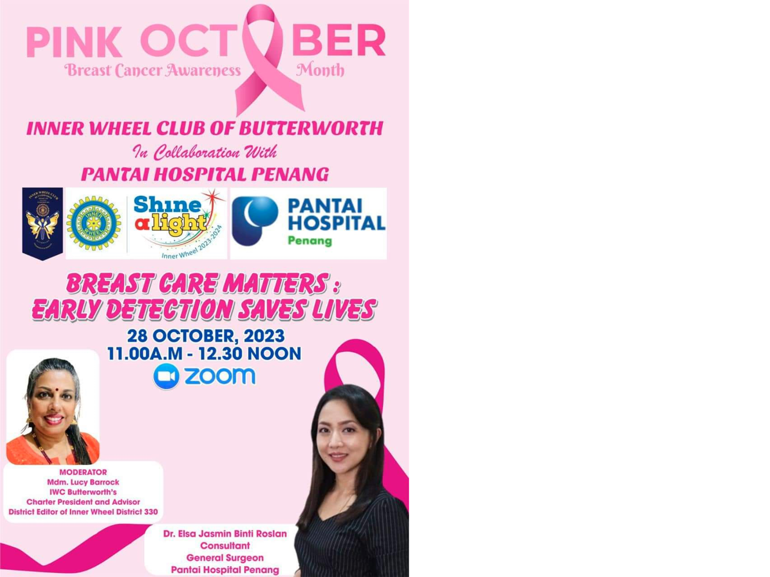 The Inner Wheel Club of Butterworth on Saturday 28th October 2023, in line with International Inner Wheel’s observance of Pink October – Breast Cancer Awareness month, organised a talk in collaboration with Pantai Hospital Penang. The club conducted whole project online via zoom to ensure maximum outreach and the invited speaker was from Pantai Hospital’s eminent General Surgeon Dr. Elsa Jasmin Roslan and there were some fifty participants joined online session.