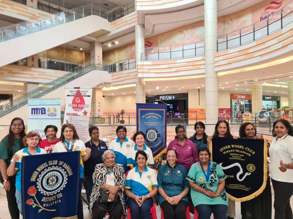 Blood Donation Drive during the International Inner Wheel Centennial celebration. This was a collaboration project organised together by IWC Bangsar, Kelab Inner Wheel Parklands and IWC Subang Selangor with a blood bank team from Hospital Tengku Ampuan Rahimah and Malaysia Medical Association (MMA) AIDS/STI’S Committee at AEON Mall, Bukit Tinggi Klang. 130 participated and out of 89 successfully donated blood. In addition, there was free physiotherapy consultation and AIDS awareness given to the participants. Charter President Mrs. Umarani from IWC Hyderabad Spandana, District 315 also participated in this project.