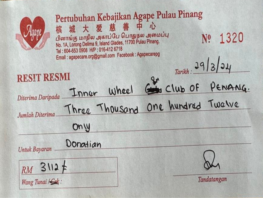 A receipt evidencing donation of RM3112 in cash made by the IWC of Penang