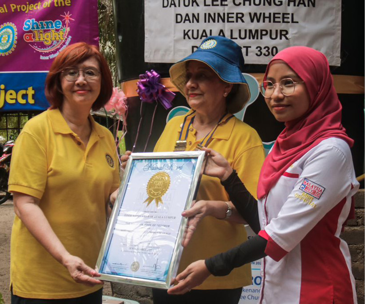 Certificate from the Malaysia Book of Records to the Inner Wheel Club of Kuala Lumpur, received by President Rani Gurmit and International Board Director Juanita Lee.