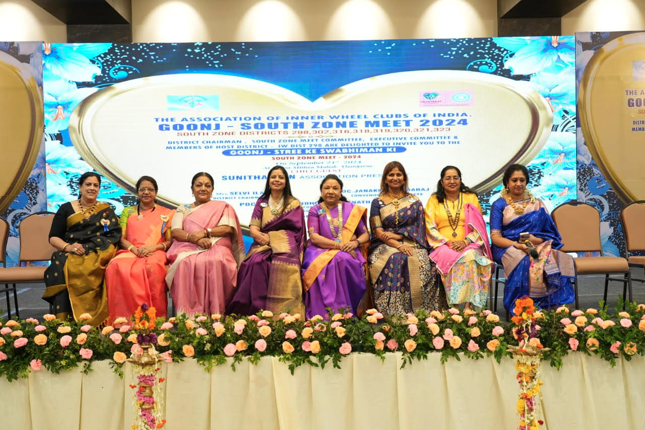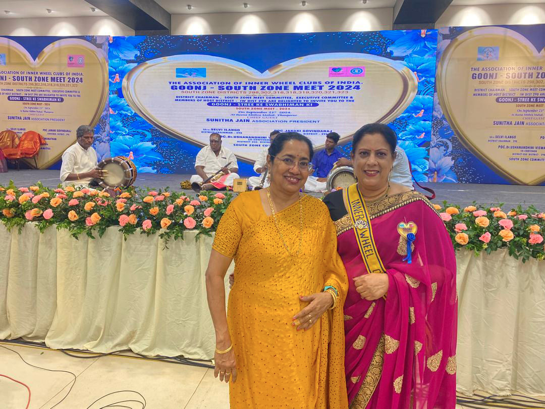 The Goonj South Zone Meet 2024 began on 20.9.24 at the prestigious Reena Mitra Hall in Thanjavur Tamil Nadu. District 298 played host to this grand gathering, bringing together members from across South Zone districts and as special guests, President K. Vijayalaxmi from IWC of Taiping and PP Tangamalar from IWC of Ipoh, District 330, Malaysia.