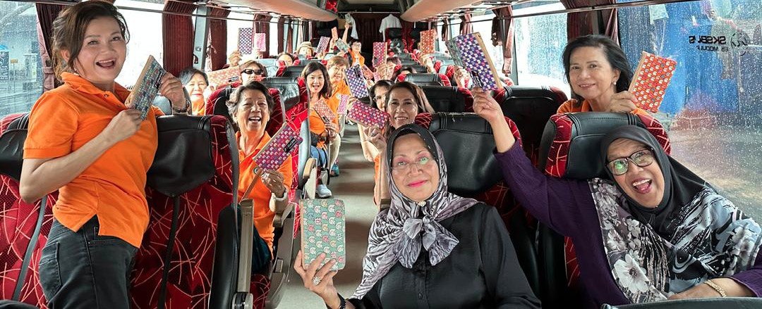 Members on board tour bus showing off the parting gift from IWC Alor Setar President Dr Rosni