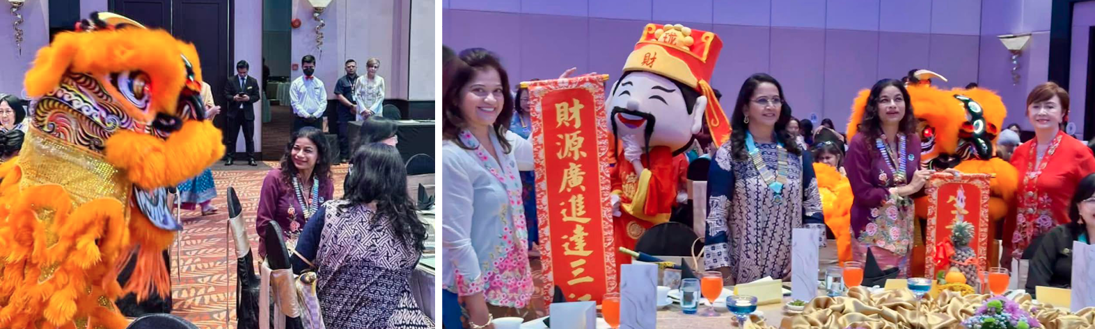 Lion (sponsored by IWCKL members) welcoming IIW President Mamta Gupta. IIW President Mamta Gupta with scroll presented by lion dancers