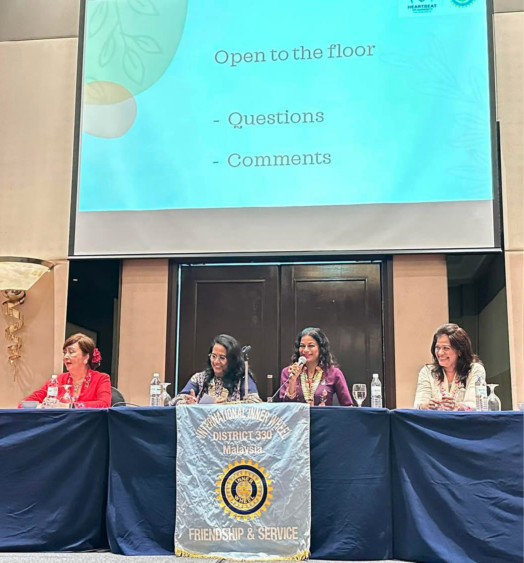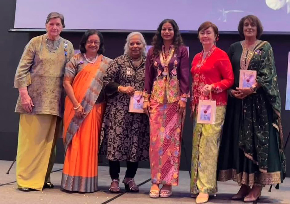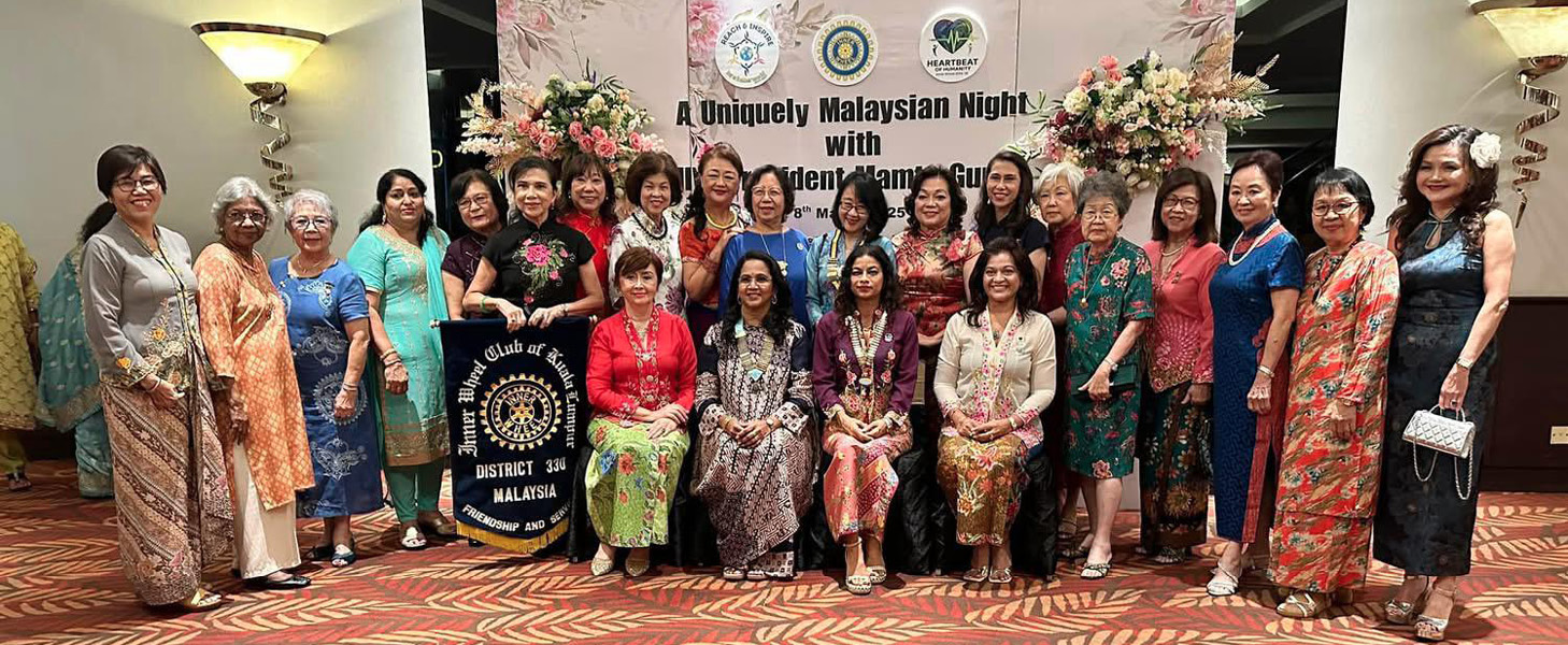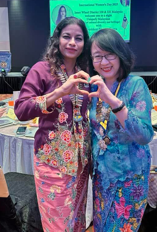 On March 8th, 2025, members of the Inner Wheel Club of Kuala Lumpur (IWCKL), along with other Inner Wheel members from Districts 330, 331 and 332, attended a “Meet & Greet” and “Night Uniquely Malaysian (a blend of cultural diversity and heritage)” event at the Eastin Hotel, Petaling Jaya, in celebration of International Women’s Day. The gathering welcomed IIW President Mamta Gupta, creating a platform for engaging dialogue and cultural immersion. The evening commenced with a stimulating Q&A session, where eight members from various districts posed insightful questions, facilitated by Vice District Chairman Jillian Estrop, eliciting valuable perspectives from President Gupta. Following the exchange, clubs had the opportunity to capture group photos with the esteemed guests, including IIWBD Juanita Lee, NR Shanti Menon, and DC Vimalavathi.