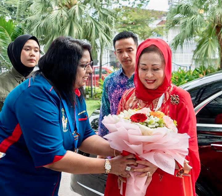 Dr Lalitha welcomed Yang Mulia Toh Puan Raja Dato’ Seri Utama Noora Ashikin Raja Abdullah with a flower bouquet