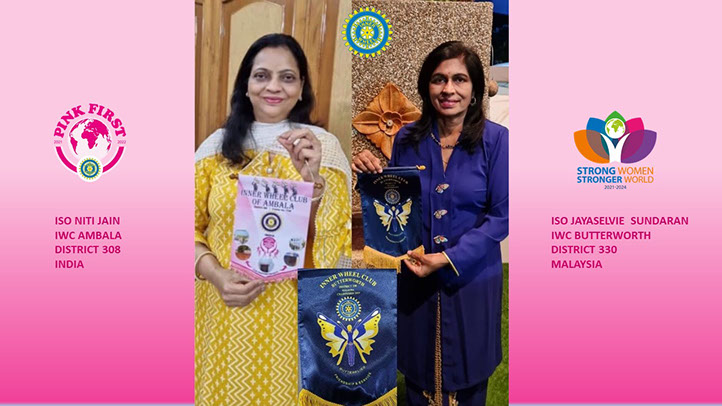 ISO Niti Jain and ISO Jayaselvie Sundaran exchanging club bannerettes
